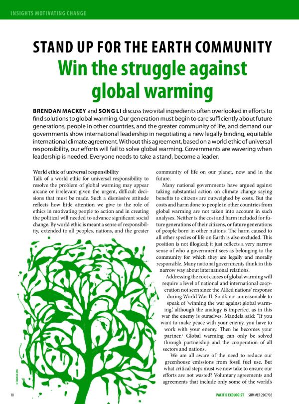 BRENDAN MAC KEY and SONG LI discuss two vital ingredients often overlooked in efforts to find solutions to global warming. Our generation must begin to care sufficiently about future generations, people in other countries, and the greater community of life, and demand our governments show international leadership in negotiating a new legally binding, equitable international climate agreement. Without this agreement, based on a world ethic of universal responsibility, our efforts will fail to solve global warming. Governments are wavering when leadership is needed. Everyone needs to take a stand, become a leader.