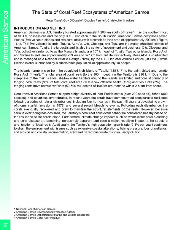 American Samoa is a U.S. Territory located approximately 4,200 km south of Hawai'i. It is the southernmost of all U.S. possessions and the only U.S. jurisdiction in the South Pacific. American Samoa comprises seven islands (five volcanic islands and two coral atolls) with a combined land area of approximately 200 km2 . The five volcanic islands, Tutuila, Aunu'u, Ofu, Olosega, and Ta'u, are the major inhabited islands of American Samoa. Tutuila, the largest island, is also the center of government and business. Ofu, Olosega, and Ta'u, collectively referred to as the Manu'a Islands, are 107 km east of Tutuila. Two outer islands, Rose Atoll and Swains Island, are approximately 259 km and 327 km from Tutuila, respectively. Rose Atoll is uninhabited and is managed as a National Wildlife Refuge (NWR) by the U.S. Fish and Wildlife Service (USFWS), while Swains Island is inhabited by a subsistence population of approximately 10 people.