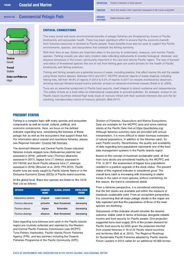 Fishing is a complex topic with many species and ecosystem components as well as social, cultural, political, and economic components. Here, we focus on the defined indicator regarding tuna, considering the biomass of these pelagic fish as well as the ecosystems that support these fish. For information about coastal and nearshore fisheries, please see Regional Indicator: Coastal fish biomass.
