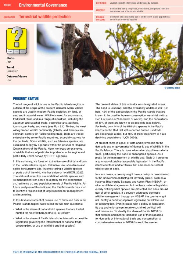 The full range of wildlife use in the Pacific islands region is outside of the scope of the present indicator. Many wildlife species are used in modern Pacific societies, on land, at sea, and in coastal areas. Wildlife is used for subsistence, traditional ritual, and in a range of industries, including the aquarium and seashell trade, decorative arts, agrifood, tourism, pet trade, and more