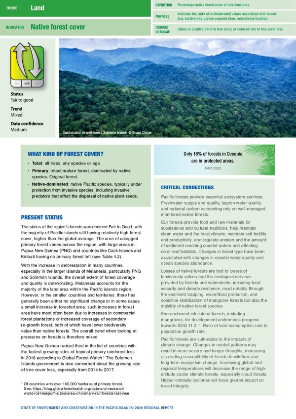 The status of the region’s forests was deemed Fair to Good, with the majority of Pacific islands still having relatively high for est cover, higher than the global average. The area of unlogged primary forest varies across the region, with large areas in Papua New Guinea (PNG) and countries like Cook Islands and Kiribati having no primary forest left