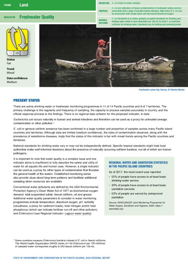 There are active drinking water or freshwater monitoring progra mmes in 11 of 14 Pacific countries and 6 of 7 territories. The primary challenge is the regularity and frequency of sampling, the capacity to process samples accurately in country, and the official response process to the findings. There is no regional data collation for this proposed indicator , to date. Escherichia coli occurs naturally in human and animal intestines and therefore can be used as a proxy for untreated sewage contamination or other pollution.