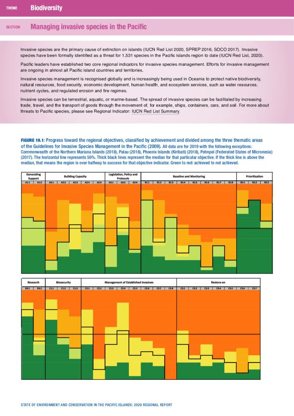 Invasive species are the primary cause of extinction on islands (IUCN Red List 2020, SPREP 2016, SOCO 2017). Invasive species have been formally identified as a threat for 1,531 species in the Pacific islands region to date (IUCN Red List, 2020). Pacific leaders have established two core regional indicators for invasive species management. Efforts for invasive management are ongoing in almost all Pacific island countries and territories. Invasive species management is recognised globally and is increasingly being used in Oceania to protect native biodiversity, natural resources, food security, economic development, human health, and ecosystem services, such as water resources, nutrient cycles, and regulated erosion and fire regimes.