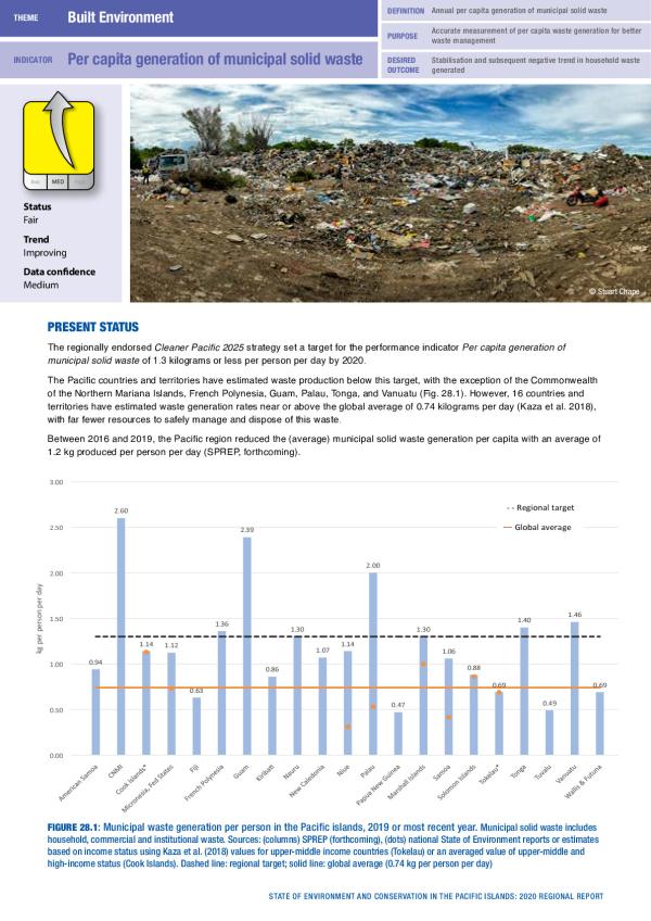 The regionally endorsed Cleaner Pacific 2025 strategy set a target for the performance indicator Per capita generation of municipal solid waste of 1.3 kilograms or less per person per day by 2020. The Pacific countries and territories have estimated waste production below this target, with the exception of the Commonwealth of the Northern Mariana Islands, French Polynesia, Guam, Palau, Tonga, and Vanuatu (Fig. 28.1). However, 16 countries and territories have estimated waste generation rates near or above the global average of 0.74 kilograms per day (Kaza et al. 2018 ), with far fewer resources to safely manage and dispose of this waste.