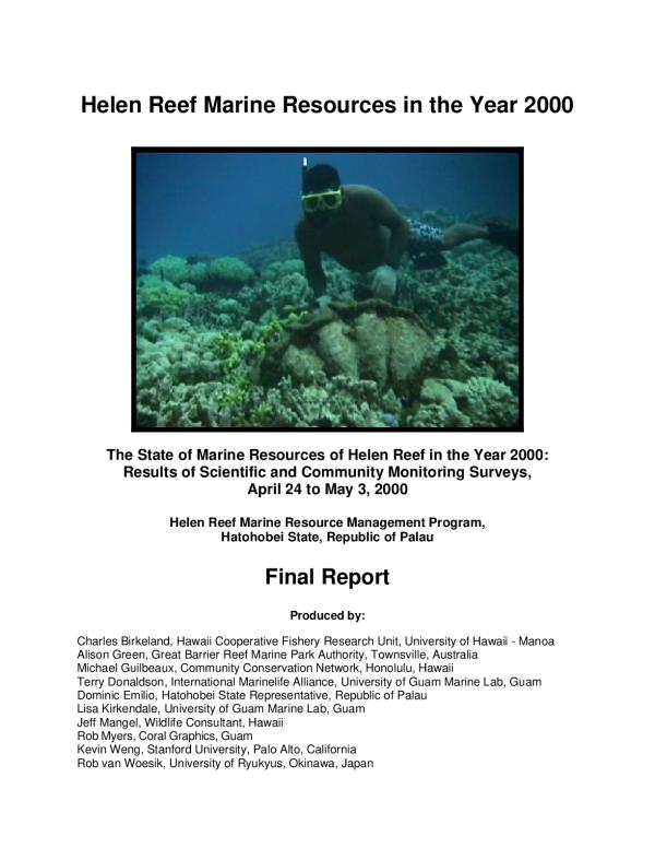 Helen Reef in the Southwest Islands of Palau is the one of the greatest marine assets of the Hatohobei (Tobi) People and of the Republic of Palau. Helen Reef is known as one of the most biologically diverse coral reef atolls in the Pacific and historically one of the most biologically abundant reefs in Palau,including acclaimed populations of plentiful marine resources including, trochus, turtles, sea cucumbers, seabirds, and many large reef fish. Reflected in its traditional Hatohobeian name Hotsarihie, which signifies Reef of the Giant Clam, Helen Reef is perhaps most famous in the region for its once ubiquitous giant clams, and unfortunately the unchecked foreign poaching that has occurred there over the past decades. The richness and abundance of the atolls resources are factors of its location, being remote from human populations and bordering the biodiverse marine eco-regions of Melanesia and SE Asia. The cumulative characteristics of the atoll have attracted many users over time including subsistence fishers from Hatohobei and neighboring islands, sea-faring traders, local businesses interests, and foreign commercial resource operations. The remoteness of Helen Reef which contributes to its historical levels of resource abundance is also a underlying cause for recent resource declines, as the atoll is usually uninhabited and has been notably vulnerable to poaching for the last half century by foreign fishermen from Asian countries