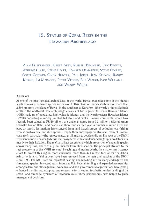 As one of the most isolated archipelagos in the world, Hawaii possesses some of the highest levels of marine endemic species in the world. This chain of islands stretches for more than 2,500 km from the island of Hawaii in the southeast to Kure Atoll (the world's highest latitude atoll) in the northwest. The archipelago consists of two regions: the main Hawaiian Islands (MHI) made up of populated, high volcanic islands; and the Northwestern Hawaiian Islands (NWHI) consisting of mostly uninhabited atolls and banks. Hawaii's coral reefs, which have recently been valued at US$10 billion, are under pressure from 1.2 million residents (more than70% live on Oahu) and nearly 7 million tourists each year. A number of urban areas and popular tourist destinations have suffered from land-based sources of pollution, overfishing, recreational overuse, and alien species. Despite these anthropogenic stressors, many of Hawaii's coral reefs, particularly the remote ones, are still in fair to good condition. The reefs of the NWHI represent almost undamaged coral reef ecosystems with abundant and large apex predators, due mostly to their isolation. The reefs also have an extremely high proportion of endemic species across many taxa, and virtually no impacts from alien species. The principal stresses to the reef ecosystems of the NWHI are coral bleaching and marine debris. In a major multi-agency effort to protect this region more efficiently, more than 470 metric tons of marine debris, primarily derelict fishing gear, have been removed from the reefs and beaches of the NWHI since 1996. The NWHI are an important nesting, and breeding site for many endangered and threatened species. In recent years, increased U.S. Federal funding and expanded partnerships among federal and state agencies, academia, and non-governmental organisations have greatly enhanced monitoring, mapping, and research efforts leading to a better understanding of the spatial and temporal dynamics of Hawaiian reefs. These partnerships have helped to guide management decisions.