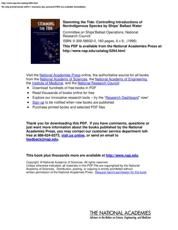 Free Executive Summary Visit the National Academies Press online, the authoritative source for all books from the National Academy of Sciences, the National Academy of Engineering, the Institute of Medicine, and the National Research Council: ⢠Download hundreds of free books in PDF ⢠Read thousands of books online for free ⢠Explore our innovative research tools â try the âResearch Dashboardâ now! ⢠Sign up to be notified when new books are published ⢠Purchase printed books and selected PDF files Thank you for downloading this PDF. If you have comments, questions or just want more information about the books published by the National Academies Press, you may contact our customer service department toll- free at 888-624-8373, visit us online, or send an email to [email protected]. This book plus thousands more are available at http://www.nap.edu. Copyright © National Academy of Sciences. All rights reserved. Unless otherwise indicated