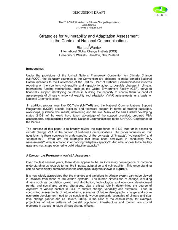Under the provisions of the United Nations Framework Convention on Climate Change (UNFCCC), the signatory countries to the Convention are obligated to make periodic National Communications to the Conference of the Parties. Part of National Communications involves reporting on the countrys vulnerability and capacity to adapt to possible changes in climate. International funding mechanisms, such as the Global Environment Facility (GEF), serve to financially support developing countries in building the capacity to enable them to conduct assessments of climate change vulnerability and adaptation (V&A) assessments as a basis for National Communications.