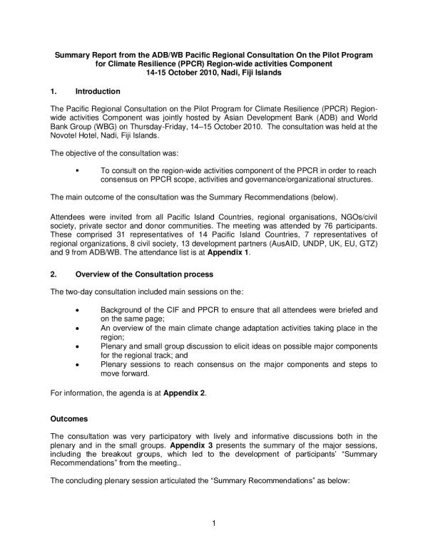 On the 14-15 October 2010, 14 Pacific Island countries met to discuss the Pilot Program for Climate Resilience. This meeting was attended by representatives from Australia, Cook Islands, Fiji Islands, Kiribati, Federated States of Micronesia, Nauru, Palau, Papua New Guinea, Republic of the Marshall Islands, Samoa, Solomon Islands, Timor-Leste, Tonga, Tuvalu, and Vanuatu. At the meeting there were also representatives from international, regional and national organizations, development partners and non-government organisations. The meeting was jointly hosted by the Asian Development Bank and the World Bank.