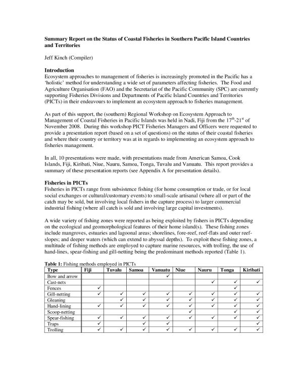 Ecosystem approaches to management of fisheries is increasingly promoted in the Pacific has a holistic method for understanding a wide set of parameters affecting fisheries. The Food and Agriculture Organisation (FAO) and the Secretariat of the Pacific Community (SPC) are currently supporting Fisheries Divisions and Departments of Pacific Island Countries and Territories (PICTs) in their endeavours to implement an ecosystem approach to fisheries management.