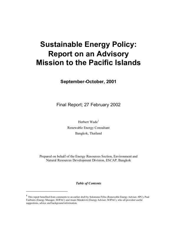 A team from ESCAP visited the Cook Islands from 5 through 12 September, 2001, to respond to a request from the Government of the Cook Islands (GoCI) for ESCAP to advise it on sustainable energy development, in particular to review existing national energy policies including legal tools, energy sector institutions and pricing issues.