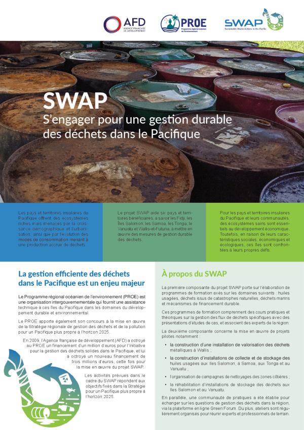 Les pays et territoires insulaires du Pacifique offrent des écosystèmes riches mais menacés par la croissance démographique et l’urbanisation, ainsi que par l’évolution des modes de consommation menant à une production accrue de déchets. Le projet SWAP aide six pays et territoires bénéficiaires, à savoir les Fidji, les Îles Salomon, les Samoa, les Tonga, le Vanuatu et Wallis-et-Futuna, à mettre en oeuvre des mesures de gestion durable des déchets.