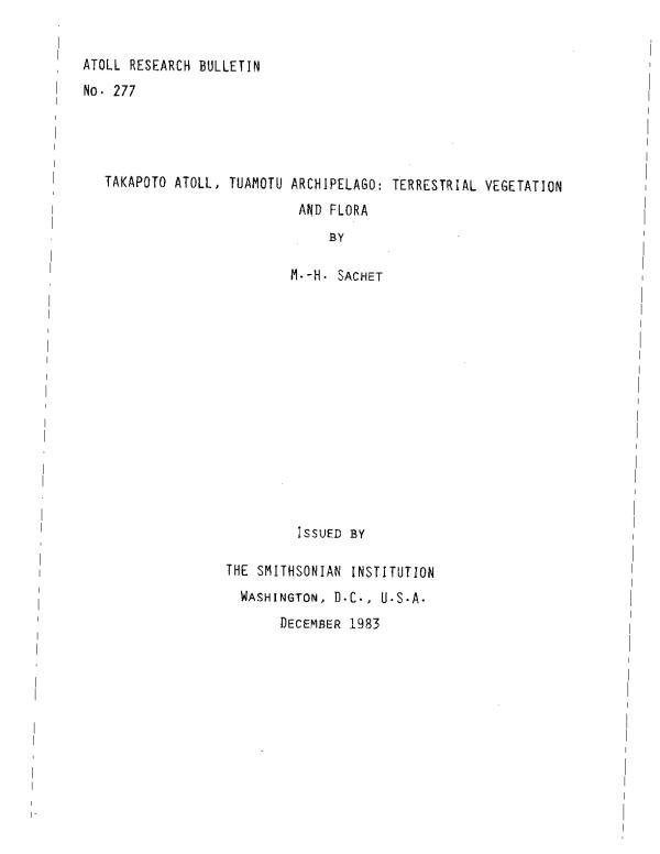 The Man and the Biosphere (MAB) programme of UNESCO, first thought of in 1968, launched in 1970 and endorsed by the Stockholm Conference of 1972, includes a number of scientific projects, of which No. 7 is devoted to the Ecology and Rational Utilization of Island Ecosystems. All the programmes are to be interdisciplinary and intergovernmental. Among member countries which developed their own national plans within the framework of the separate MAB projects, France drafted a vigorous one in MAB 7 in French Polynesia, under the leadership of Dr. B. Salvat (1977). The French programme includes a detailed study of an atoll, Takapoto in the Tuamotus, and comparison of its ecosystems and their functioning with those of a high island already under scrutiny, Moorea in the Society Islands.