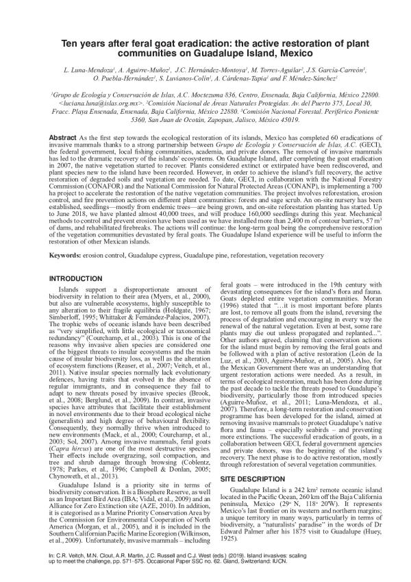 As the ?rst step towards the ecological restoration of its islands, Mexico has completed 60 eradications of invasive mammals thanks to a strong partnership between Grupo de Ecología y Conservación de Islas, A.C. (GECI), the federal government, local ?shing communities, academia, and private donors. The removal of invasive mammals has led to the dramatic recovery of the islands ecosystems. On Guadalupe Island, after completing the goat eradication in 2007, the native vegetation started to recover. Plants considered extinct or extirpated have been rediscovered, and plant species new to the island have been recorded. However, in order to achieve the islands full recovery, the active restoration of degraded soils and vegetation are needed. To date, GECI, in collaboration with the National Forestry Commission (CONAFOR) and the National Commission for Natural Protected Areas (CONANP), is implementing a 700 ha project to accelerate the restoration of the native vegetation communities. The project involves reforestation, erosion control, and ? re prevention actions on different plant communities: forests and sage scrub. An on-site nursery has been established, seedlingsmostly from endemic treesare being grown, and on-site reforestation planting has started. Up to June 2018, we have planted almost 40,000 trees, and will produce 160,000 seedlings during this year. Mechanical methods to control and prevent erosion have been used as we have installed more than 2,400 m of contour barriers, 57 m3 of dams, and rehabilitated ?rebreaks. The actions will continue: the long-term goal being the comprehensive restoration of the vegetation communities devastated by feral goats. The Guadalupe Island experience will be useful to inform the restoration of other Mexican islands.
