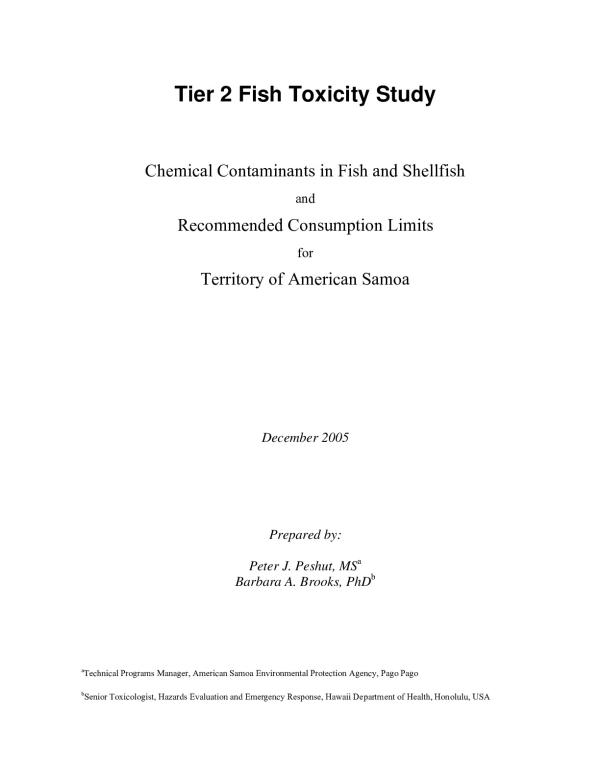 This report presents results from a study for selected contaminants in fish and shellfish collected from the United States Territory of American Samoa, located in the tropical South Pacific. This study was conducted at the Tier 2-level in accordance with US EPA protocols, and follows previously completed Tier 1-level screening studies for the Territory. Data collected were used to recommend consumption limits for fish and shellfish that contain elevated concentrations of inorganic arsenic (As(i)), lead (Pb), mercury (Hg), and polychlorinated biphenyls (PCBs).