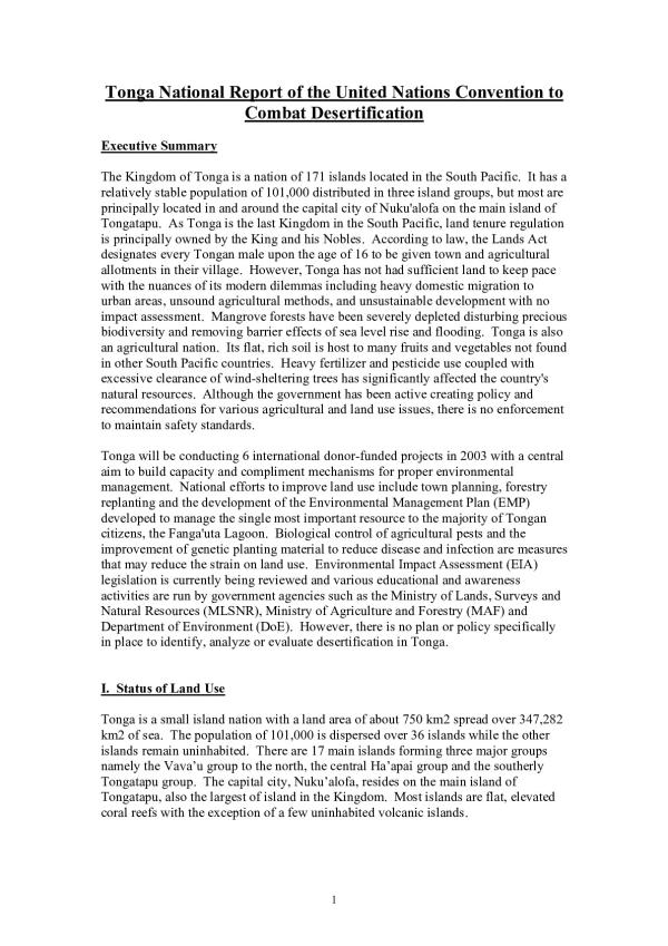 The Kingdom of Tonga is a nation of 171 islands located in the South Pacific. It has a relatively stable population of 101,000 distributed in three island groups, but most are principally located in and around the capital city of Nukualofa on the main island of Tongatapu. As Tonga is the last Kingdom in the South Pacific, land tenure regulation is principally owned by the King and his Nobles. According to law, the Lands Act designates every Tongan male upon the age of 16 to be given town and agricultural allotments in their village. However, Tonga has not had sufficient land to keep pace with the nuances of its modern dilemmas including heavy domestic migration to urban areas, unsound agricultural methods, and unsustainable development with no impact assessment. Mangrove forests have been severely depleted disturbing precious biodiversity and removing barrier effects of sea level rise and flooding. Tonga is also an agricultural nation. Its flat, rich soil is host to many fruits and vegetables not found in other South Pacific countries. Heavy fertilizer and pesticide use coupled with excessive clearance of wind-sheltering trees has significantly affected the country's natural resources. Although the government has been active creating policy and recommendations for various agricultural and land use issues, there is no enforcement to maintain safety standards.