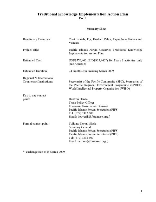 The mandate of the Pacific Island Forum Secretariat (PIFS) to develop frameworks for Traditional Knowledge (TK) protection arose at the Forum Trade Ministers Meeting in 1999 out of a recognition that the regions traditional and cultural resources were being improperly exploited without due compensation to TK owners. Work on TK aims to address this on two levels through the development of regional frameworks for 1) Traditional Biological Resources (protection of traditional plants, medicinal knowledge etc), in collaboration with the Secretariat of the Pacific Regional Environmental Programme (SPREP); and 2) Traditional Knowledge and Expressions of Culture (TKEC) (protection of traditional arts, songs, dances etc.), in collaboration with the Secretariat of the Pacific Community (SPC).