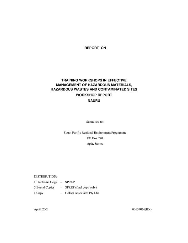 Microsoft Word - 39026rbx_Final_Nauru REPORT ON TRAINING WORKSHOPS IN EFFECTIVE MANAGEMENT OF HAZARDOUS MATERIALS, HAZARDOUS WASTES AND CONTAMINATED SITES WORKSHOP REPORT NAURU Submitted to : South Pacific Regional Environment Programme PO Box 240 Apia, Samoa DISTRIBUTION: 1 Electronic Copy - SPREP 5 Bound Copies - SPREP (final copy only) 1 Copy - Golder Associates Pty Ltd April, 2001 00639026(BX)April, 2001 - i - 00639026(BX) Golder Associates TABLE OF CONTENTS SECTION PAGE 1.0 INTRODUCTION .......................................................................................... 1 2.0 WORKSHOP PARTICIPANTS ..................................................................... 1 2.1 Organisations Represented ..................................................................... 1 2.2 Organisations Not Represented .............................................................. 2 3.0 MAJOR ISSUES IDENTIFIED...............................