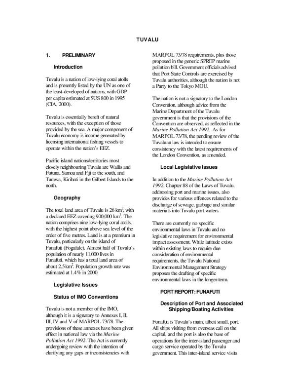 Tuvalu is a nation of low-lying coral atolls and is presently listed by the LIN as one of the least-developed of nations, with GDP per capita estimated at $US 800 in 1995 (CIA. 2000). Tuvalu is essentially bereft of natural resources, with the exception of those provided by the sea. A major component of Tuvalu economy is income generated by licensing international fisliing vessels to operate within the nation's EEZ.