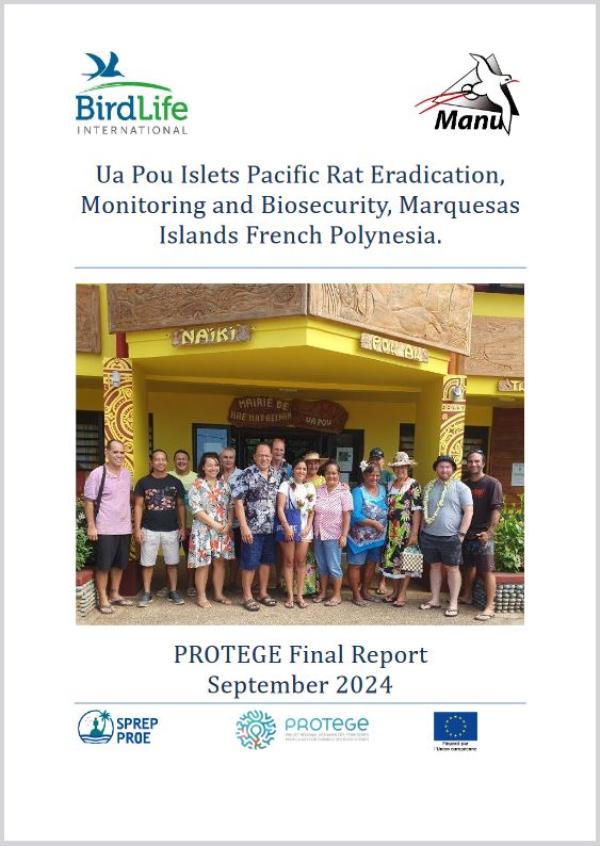 The Ua Pou islets Pacific rat eradication operation was undertaken in August-September 2023. It attempted a global first of aerially broadcasting rodent bait by drone from a small ship in open sea across the islets of Motu Tākaè, Motu Oa, and Motu Mokohe, at Ua Pou in the Marquesas Islands. The aerial bait application resulted in only two of the three islands having bait successfully applied across their entirety, nonetheless, monitoring 12 months later has confirmed Motu Oa and Motu Tākaè are rat free as is the partially isolated section of Motu Mokohe that was also baited. The eradication success is supported by the establishment of biosecurity knowledge and practices throughout the Ua Pou communities. The results of the seabird and other environmental monitoring will help sustain a commitment over time, as well as benefiting the wider conservation community. The operation demonstrated that drones could be operated off a boat for rodent eradication purposes but was constrained by the consistently strong winds and swell conditions. A larger vessel with a deeper draught is recommended for similar operations in the future and would likely increase the number of flyable days and improve the ease with which take-offs and landings are undertaken by the drone pilots.