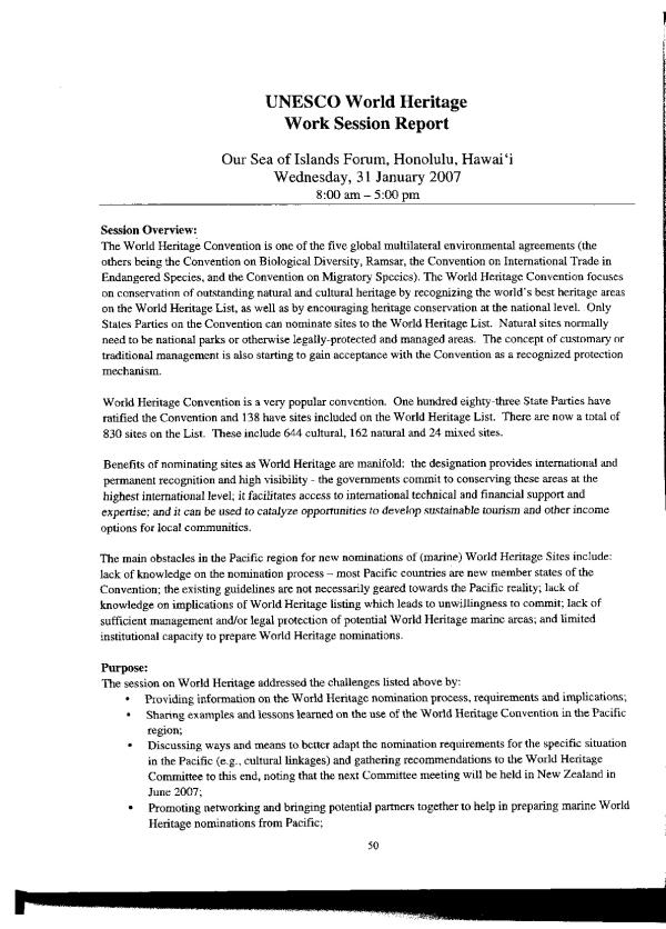 The World Heritage Convention is one of the five global multilateral environmental agreements (the others being the Convention on Biological Diversity, Ramsar, the Convention on International Trade in Endangered Species, and the Convention on Migratory Species). The World Heritage Convention focuses on conservation of outstanding natural and cultural heritage by recognizing the world's best heritage areas on the World Heritage List, as well as by encouraging heritage conservation at the national level. Only States Parties on the Convention can nominate sites to the World Heritage List. Natural sites normally need to be National Parks or otherwise legally- protected and managed areas. The concept of customary or traditional management is also starting to gain acceptance with the Convention as a recognized protection mechanism.
