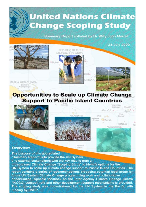 The purpose of this abbreviated Summary Report is to provide the UN System and external stakeholders with the key results from a broad-based Climate Change Scoping Study to identify options for the UN System to scale up climate change support to Pacific Island Countries. The report contains a series of recommendations proposing potential focal areas for future UN System Climate Change programming work and collaborative opportunities. Specific feedback on the Inter Agency Climate Change Centre (IACCC) concept note and other development support mechanisms is provided. The scoping study was commissioned by the UN system in the Pacific with funding by UNDP.