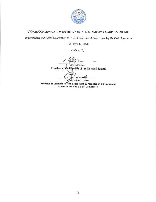 Like so many communities and territories, even the planet itself, placed in peril by today's global climate emergency, the Republic of the Marshall Islands (RMI) future relies on the full and effective implementation of the Paris Agreement. The Nationally Determined Contributions (NDCs) under the Agreement, spelling out how each nation contributes to it, have thereby become the most important public documents for the future of the world and the survival of our human civilization as we know it.