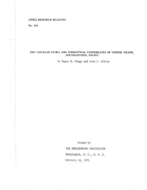 In 1965 Vostok Island was visited briefly by Sibley and five members of the Pacific Ocean Biological Survey Program (POBSPJ of the Smithsonian Institution. Observations were made from 0900 15 June through 1300 16 June and collections were made of vascular plants, fish, reptiles, birds, mammals, and avian ectoparasites. A small number of seabirds was banded.