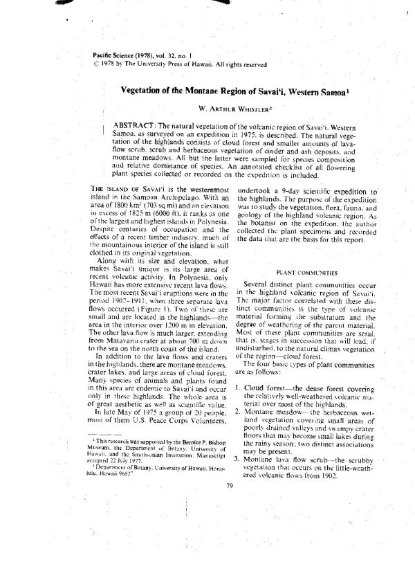 The natural vegetation of the volcanic region of Savai'i. Western Samoa, as surveyed on an expedition in 1975. is described. The natural vegetation of the highlands consists of cloud forest and smaller amounts of lava- flow scrub, scrub and herbaceous vegetation of cinder and ash deposits, and montane meadows. All but the latter were sampled for species composition and relative dominance of species. An annotated checklist of all flowering plant species collected or recorded on the expedition is included.