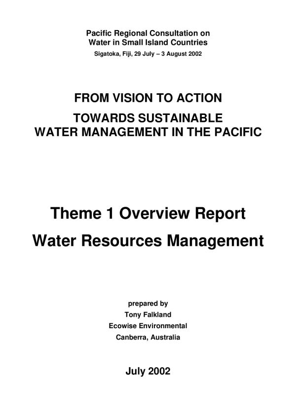 The integrated and sustainable management of water resources in small island countries of the Pacific and other regions is vital for the health and social well being of their people, the protection of their environments and the development of their economies. The very limited nature of water resources, the vulnerability of these islands and their resources, including water, to natural disasters, over-exploitation and pollution combined with increasing demands for freshwater due to expanding populations and, in some cases, tourism, industry and agriculture, makes the sustainable management of water resources a very high priority. In reality, there are many issues which currently constrain the achievement of the goal of sustainable water resources management. At the national level, there is often fragmentation in the water sector, inadequate water resources legislation, policy and planning. There is often insufficient local human resources capacity to conduct water resources assessment and monitoring. In many islands, there is insufficient hydrological data available for analysis and water resources planning. Other issues include conflicts related to use of water resources and locations of water supply systems on customary land, problems with designs and implementation of projects, and insufficient community education, awareness & participation. In addition, there are some water resources issues which require further applied research and training in order to better understand them and to disseminate results