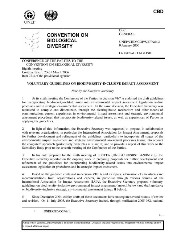 At its sixth meeting the Conference of the Parties, in decision VI/7 A endorsed the draft guidelines for incorporating biodiversity-related issues into environmental impact assessment legislation and/or processes and in strategic environmental assessment. In the same decision, the Executive Secretary was requested to compile and disseminate, through the clearing-house mechanism and other means of communication, current experiences in environmental impact assessment and strategic environmental assessment procedures that incorporate biodiversity-related issues, as well as experiences of Parties in applying the guidelines.