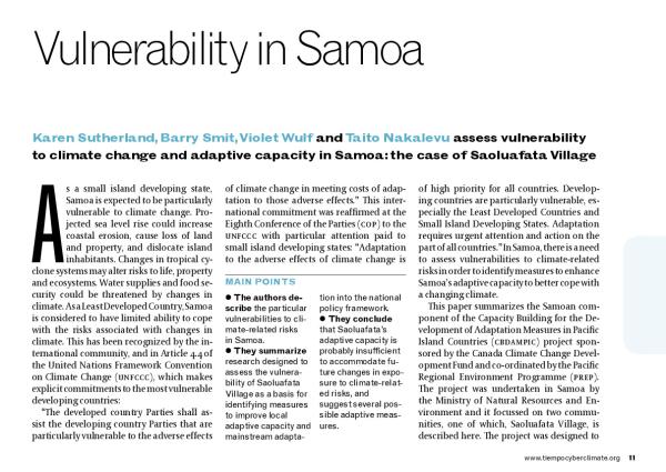 As a small island developing state, Samoa is expected to be particularly vulnerable to climate change. Projected sea level rise could increase coastal erosion, cause loss of land and property, and dislocate island inhabitants. Changes in tropical cyclone systems may alter risks to life, property and ecosystems. Water supplies and food security could be threatened by changes in climate. As a Least Developed Country, Samoa is considered to have limited ability to cope with the risks associated with changes in climate. This has been recognized by the international community, and in Article 4.4 of the United Nations Framework Convention on Climate Change (UNFCCC), which makes explicit commitments to the most vulnerable developing countries: