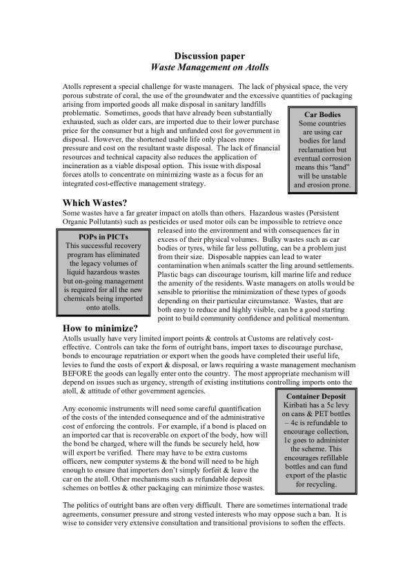 Atolls represent a special challenge for waste managers. The lack of physical space, the very porous substrate of coral, the use of the groundwater and the excessive quantities of packaging arising from imported goods all make disposal in sanitary landfills problematic. Sometimes, goods that have already been substantially exhausted, such as older cars, are imported due to their lower purchase price for the consumer but a high and unfunded cost for government in disposal. However, the shortened usable life only places more pressure and cost on the resultant waste disposal. The lack of financial resources and technical capacity also reduces the application of incineration as a viable disposal option. This issue with disposal forces atolls to concentrate on minimizing waste as a focus for an integrated cost-effective management strategy'.