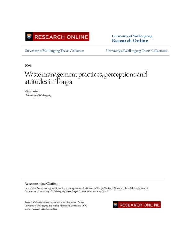 The Kingdom of Tonga faces critical problems with regards to managing waste. Increasing generation of solid waste in the household accompanying the changes in the Tongan lifestyle with a dependence on imported tinned and packaged goods, far exceeds the island Kingdom's ability and capability for safe disposal.