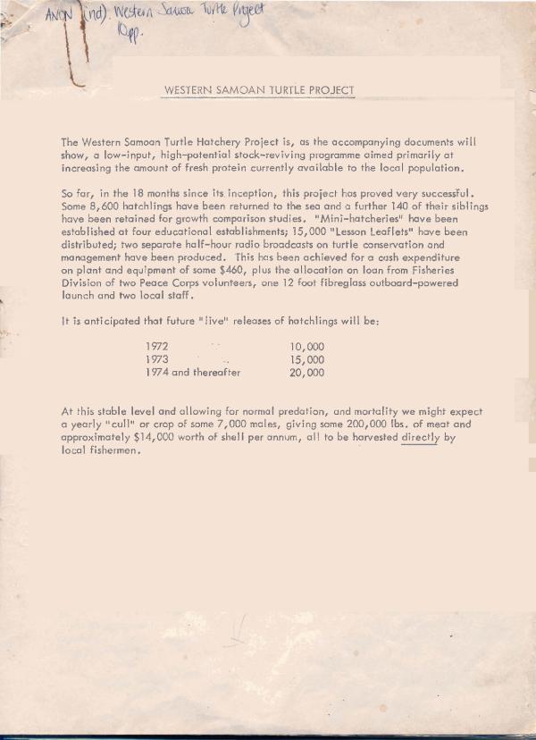 The Western Samoan Turtle Hatchery Project is, as the accompanying documents will show, a low-input, high-potential stock-reviving programme aimed primarily at increasing the amount of fresh protein currently available to the local population.