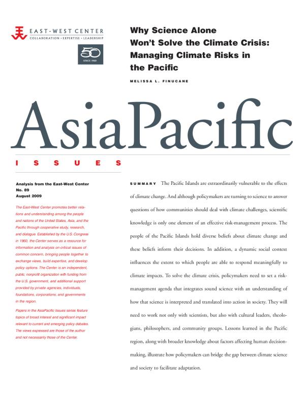 The Pacific Islands are extraordinarily vulnerable to the effects of climate change. And although policymakers are turning to science to answer questions of how communities should deal with climate challenges, scientific knowledge is only one element of an effective risk-management process. The people of the Pacific Islands hold diverse beliefs about climate change and these beliefs inform their decisions. In addition, a dynamic social context influences the extent to which people are able to respond meaningfully to climate impacts. To solve the climate crisis, policymakers need to set a risk-management agenda that integrates sound science with an understanding of how that science is interpreted and translated into action in society. They will need to work not only with scientists, but also with cultural leaders, theologians, philosophers, and community groups. Lessons learned in the Pacific region, along with broader knowledge about factors affecting human decision- making, illustrate how policymakers can bridge the gap between climate science and society to facilitate adaptation.